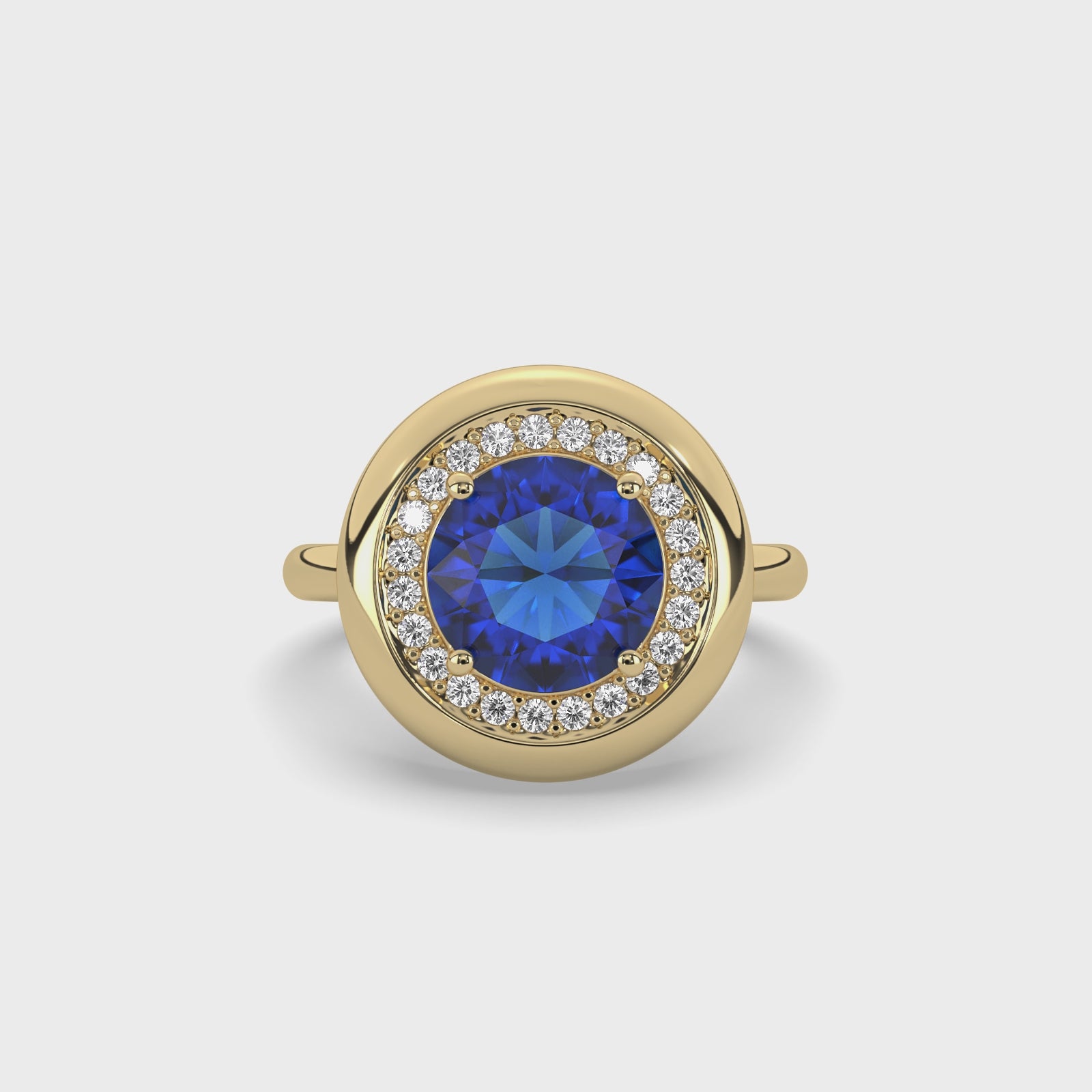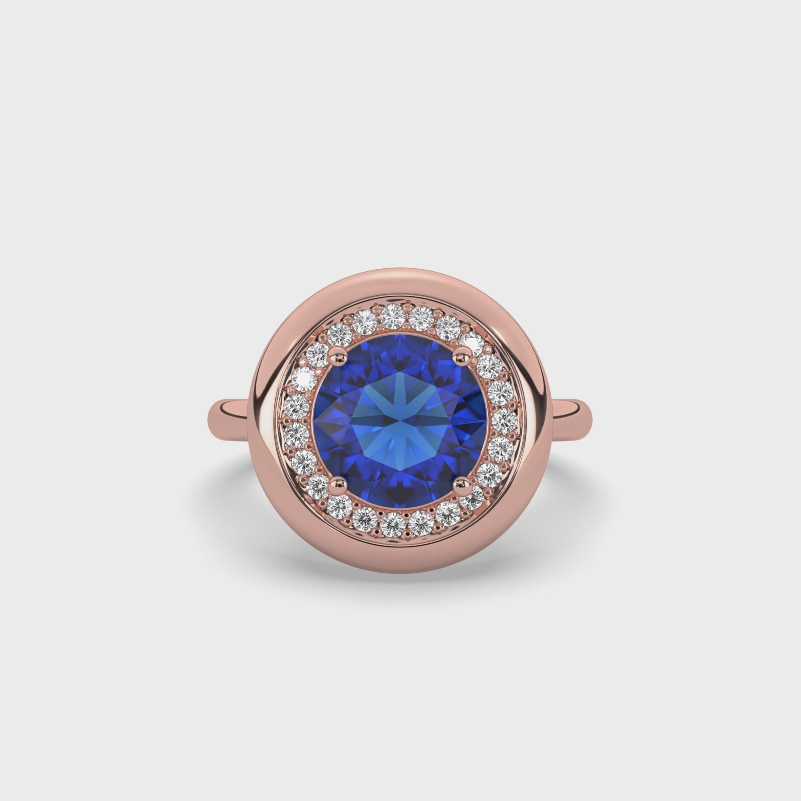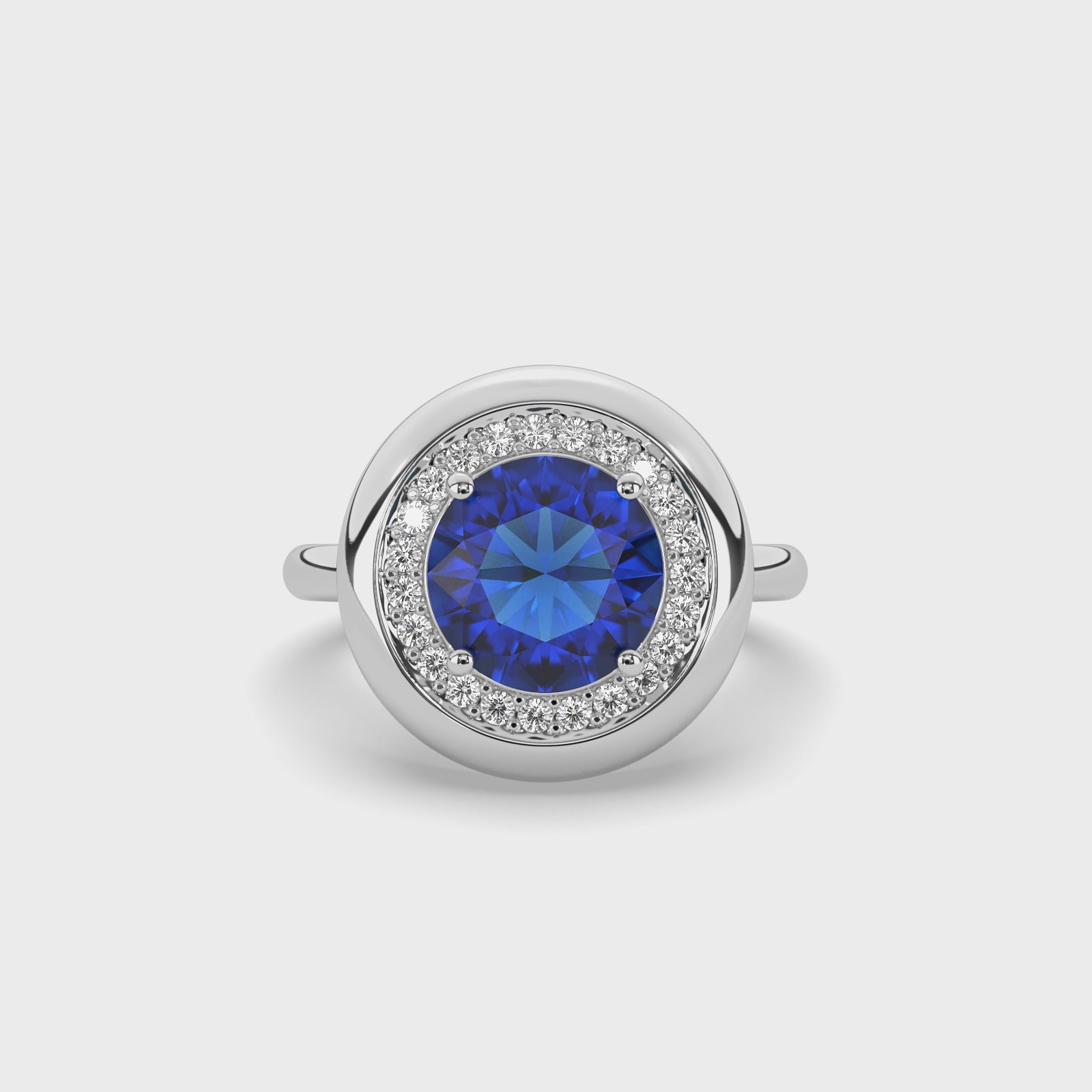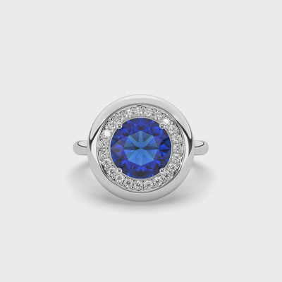 - Gemstone: 2.0 Carat Lab Blue Sapphire, 0.21 Carat Lab Diamond Halo