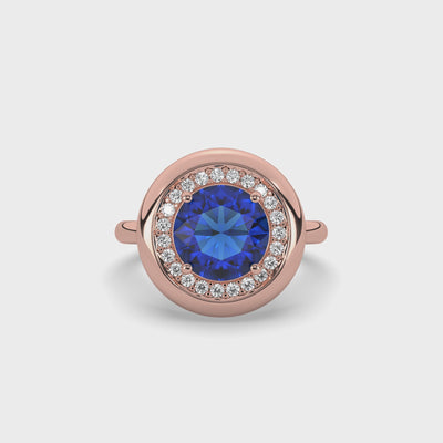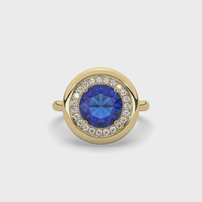 The Diana Blue Sapphire and & Diamond Ring centers a deep blue sapphire within a halo of diamonds, creating a silhouette that feels both archival and intimate. Balanced in proportion and light, it offers a refined presence designed to endure beyond the moment.