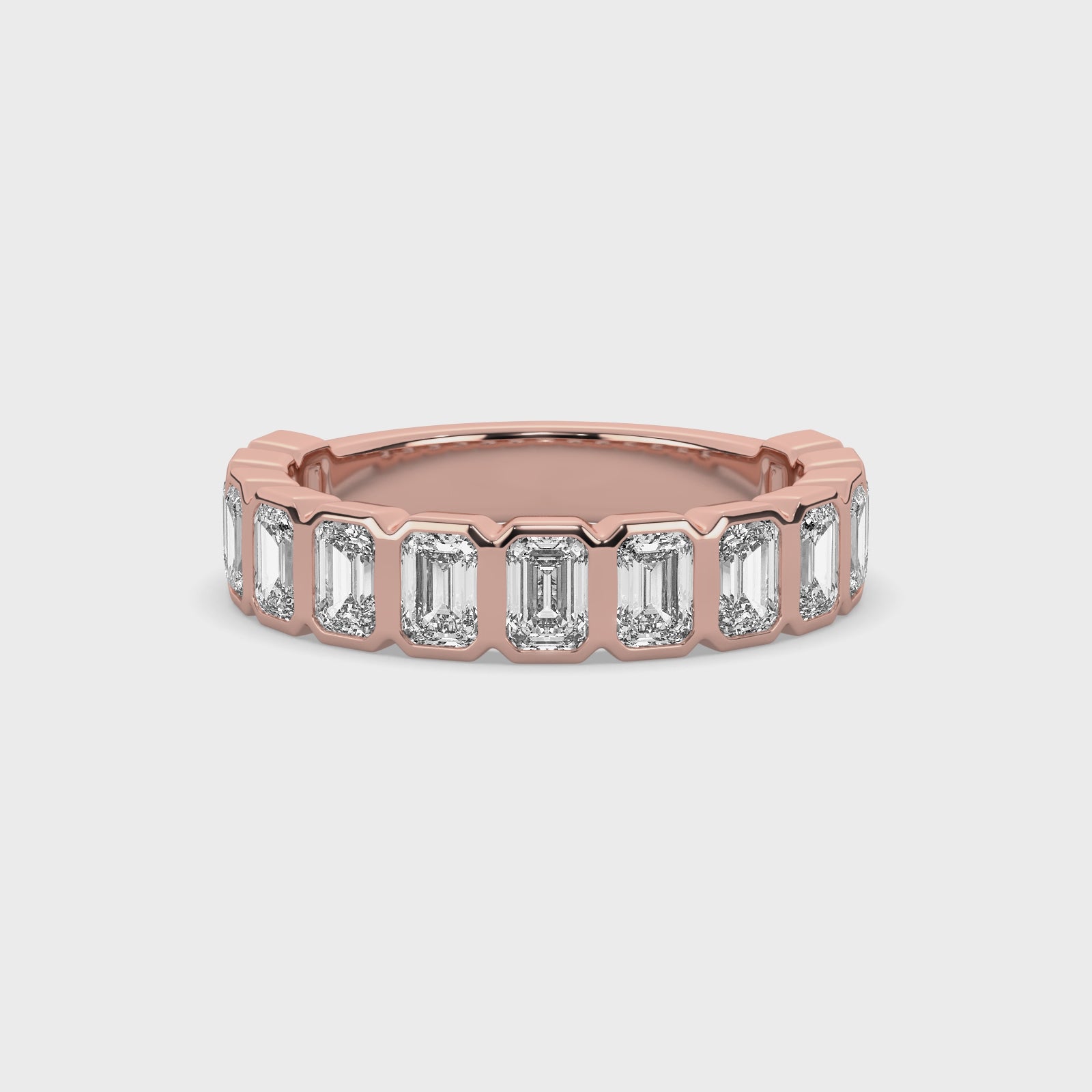Defined by the clean geometry of emerald-cut stones, the Carolyn band balances structural precision with effortless light. The bezel setting creates a seamless, modern profile that feels both substantial and enduring.
