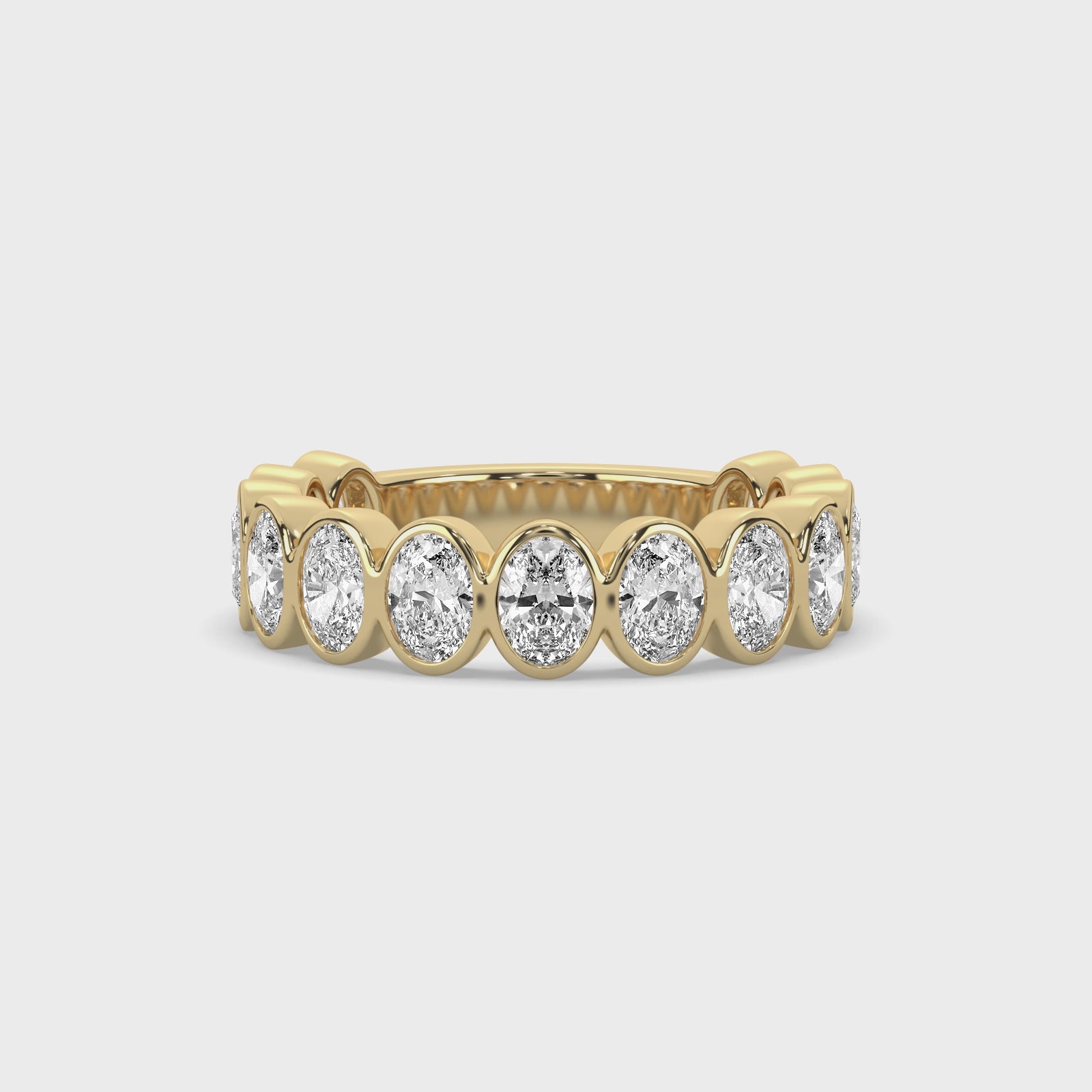 A study in balance and form, this band features a rhythmic arrangement of oval diamonds, each defined by a clean bezel setting. The design prioritizes comfort and continuous light, with a three-quarter coverage that sits low and smooth against the finger. It is a piece of quiet strength, crafted to feel both modern and enduring.