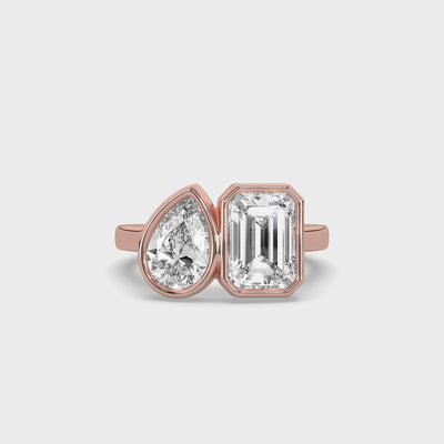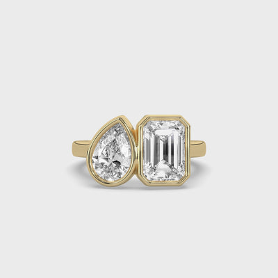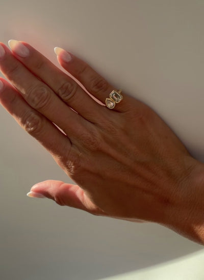 Two stones, two shapes, one deliberate composition. The Toi Et Moi Bezel Signet Ring pairs a soft pear diamond with the clean architectural lines of an emerald cut — a dialogue between form and feeling, held together in a full bezel setting that protects without obscuring. Inspired by Carolyn Bessette-Kennedy and the private elegance she carried so effortlessly, this ring belongs to women who understand that the most enduring things are worn close, and chosen once.