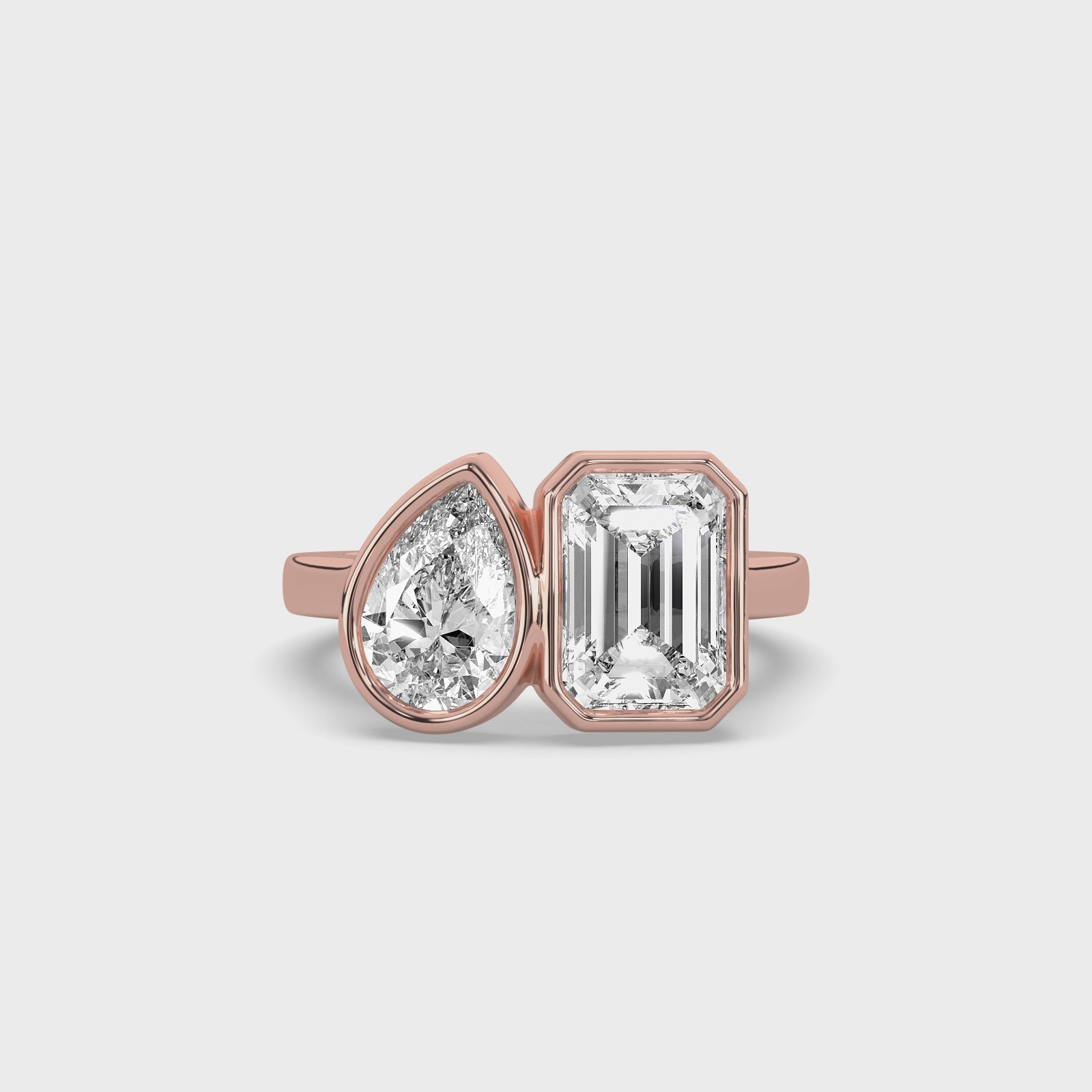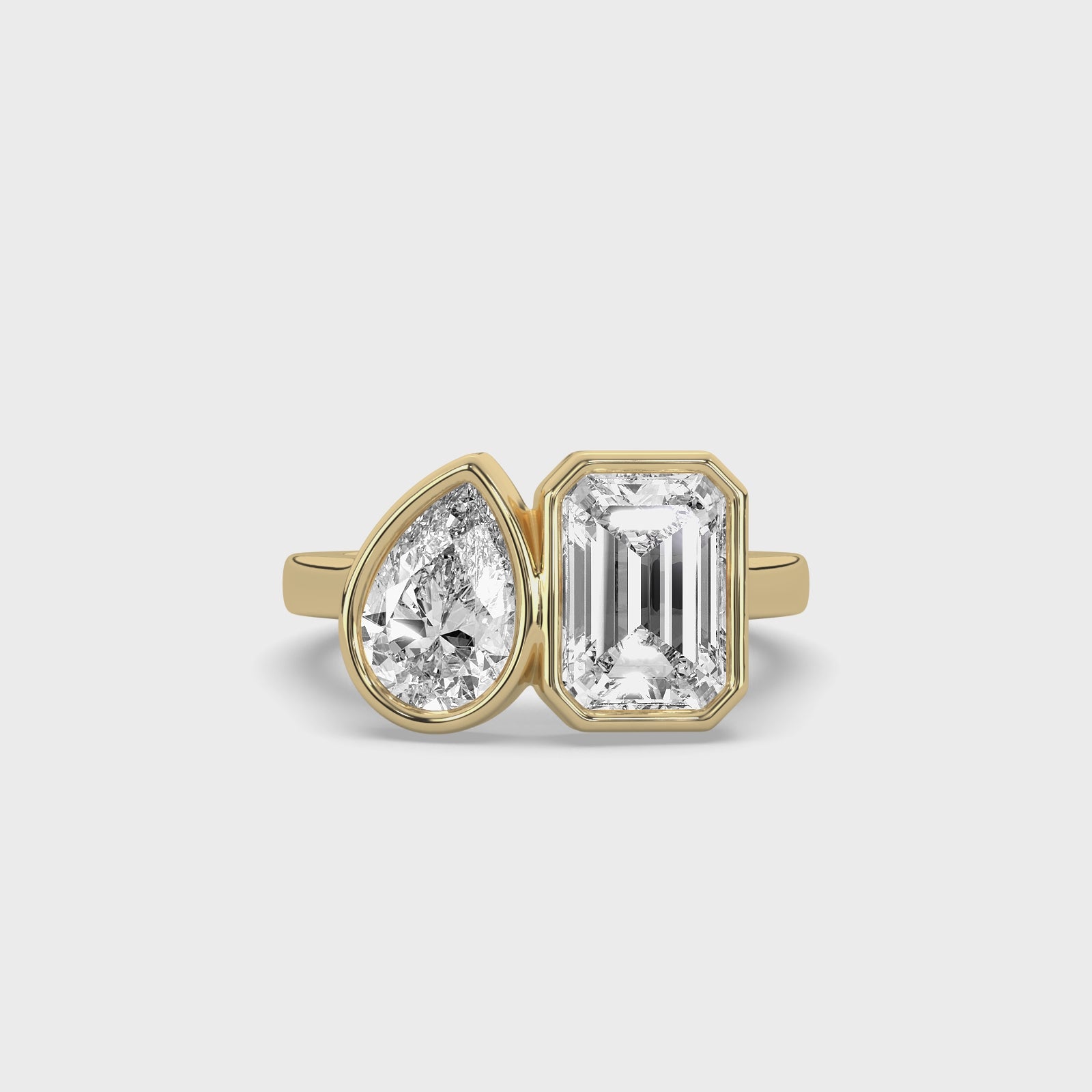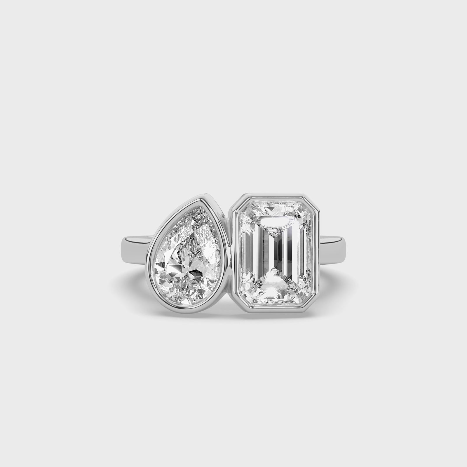 - Gemstone: 0.74 ct pear-cut lab-grown diamond; 1.44 ct emerald-cut lab-grown diamond — both bezel set